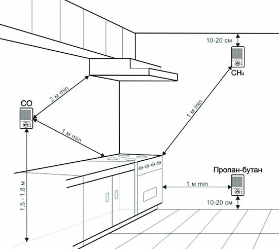 датчик, определяющий угарный газ, — на высоте источника потребления газа или ниже его (на высоте 1,5-1,8 м от пола, но не ближе чем 0,3 м до потолка);